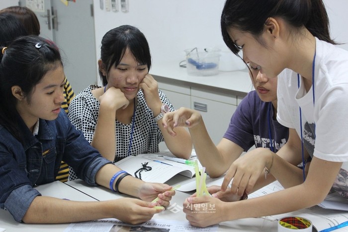 지난 18일 경기 파주시에 위치한 영어마을 파주캠프에서 한국, 태국, 일본, 러시아의 학생 총 100여명이 참가하는 '중·고등학생 국제교류 캠프'에 참가한 학생들이 프로젝트를 수행하고 있다. (사진제공=경기도청북부청사)