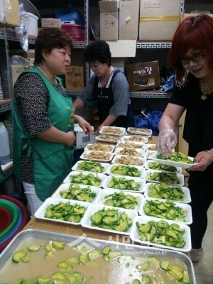 경기 동두천시 송내동 새마을부녀회에서는 19일 홀몸노인이나 장애인 등 몸이 불편한 복지대상자를 위해 해물파장떡, 호박볶음, 두부조림 등의 반찬을 직접 만들고 당일 대상자 집을 방문해 전달했다. 사진은 반찬을 준비하고 있는 새마을부녀회원들의 모습. (사진제공=동두천시청)