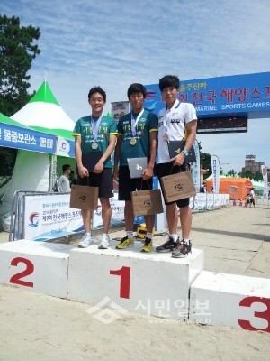 경기 이천시청 트라이애슬론팀이 지난 14~17일에 울산 울주군 진하해수욕장에서 열린 '제9회 전국해양스포츠제전'에서 남자 엘리트부 23세 이하 부문 1, 2위를 차지했다. 이천시청 소속 이대영 선수는 1시간 2분 14초로 1위를 기록했고 이후 이은성 선수가 그 뒤를 이어 2위를 기록했다. 사진은 시상대에서 기념촬영을 하고 있는 선수들의 모습. (사진제공=이천시청)