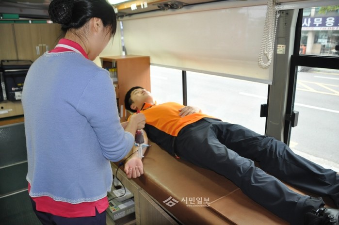 인천남부소방서는 20일 오전 대한적십자사와 함께 사회 공헌 프로그램의 일환으로 '사랑의 헌혈 행사'를 실시했다. 사진은 헌혈에 동참한 남부소방서 직원의 모습. (사진제공=남부소방서)