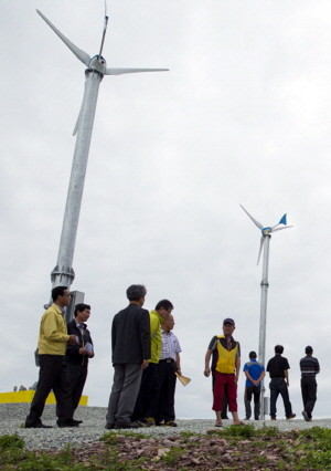 전남 해남군은 화산면 삼마도에 150㎾ 규모의 신재생에너지 발전시스템을 갖춰 전국 최초 '에너지 자립섬'이 됐다고 20일 밝혔다. 사진은 삼마도에 설치된 풍력발전과 현장 점검하는 관계자들. (사진제공=해남군)