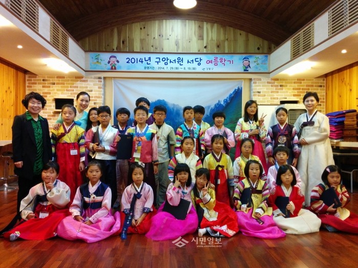 사자소학, 전통문화·예절수업을 통해 인성교육의 장을 마련하고 있는 '구암서원 여름특강 수료식'이 지난 19일 서울 암사동유적 제2전시관 교육실에서 열렸다. 사진은 이날 수료식에 참석한 초등학생 26명이 알록달록 예쁜 한복을 입고 밝게 웃는 모습. (사진제공=강동구청)