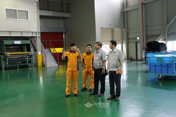 우근제 양주소방서장(왼쪽 첫번째)과 홍죽산업단지 관계자들이 홍죽산업단지내 공장 내·외부를 둘러보며 현지소방시설에 대한 시찰을 실시하고 추석절 연휴 기간 시설물 안전관리 및 소방시설 관리 철저 등 화재예방 및 안전관리를 지도하고 있다. (사진제공=양주소방서)