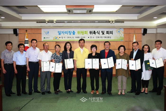 서울 강북구가 일자리창출위원회를 구성해 지난 19일 구청 기획상황실에서 위촉식을 진행했다. 구의원과 공인노무사 등 외부전문가들로 구성된 위원회는 앞으로 일자리 종합대책과 정책에 관한 협의·자문 등 구의 일자리 창출을 위한 각종 대책 수립과 업무추진에 많은 역할을 한다. 사진은 위촉식 후 박겸수 강북구청장(가운데)과 위원들이 기념촬영을 하는 모습. (사진제공=강북구청)