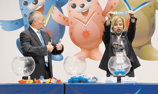 2014 인천 아시안게임 조추첨 행사가 열린 21일 오전 인천 중구 하버파크호텔에서 기계체조 여자 추첨에서 대한민국이 호명되고 있다. 북한은 이번 인천아시안게임에서 기계체조(남,여)와 축구(남,여)에 출전한다.
