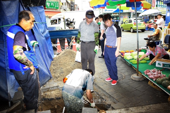 서울 강북구의회 박문수 의원이 최근 배수불량으로 항상 물이 고여 있어 주민 이동 불편을 야기했던 수유전통시장의 빗물받이 보수공사현장에 방문했다. 사진은 박 의원(오른쪽)과 관계자들이 현장을 방문한 모습. (사진제공=강북구의회)