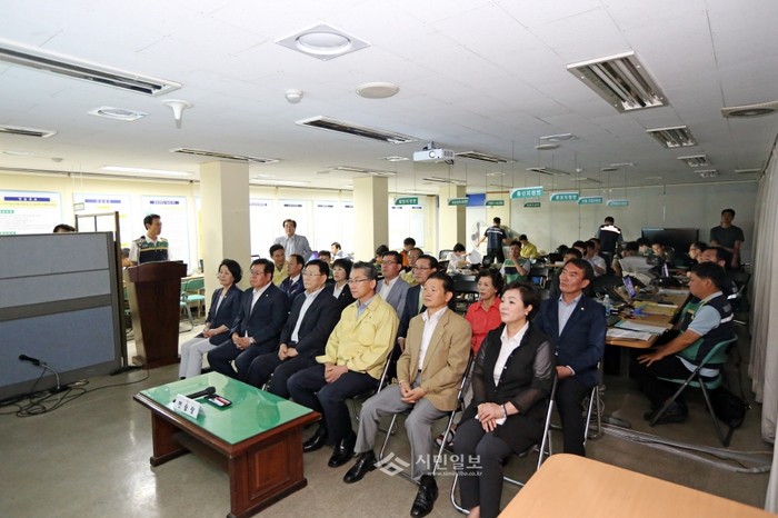 최근 서울 종로구의회 김복동 의장(앉은 첫줄 왼쪽 세번째)과 의원들이 종로구청 합동상황실을 방문해 구청 근무자들의 노고를 격려하고 '2014 을지연습' 상황보고를 받고 있다. (사진제공=종로구의회)