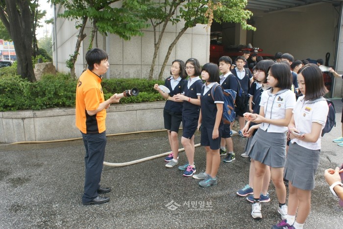 최근 인천공단소방서에서 지역내 초·중·고등학생 및 대학생을 대상으로 진행되는 소방서견학 및 '119직업체험 교육'에 참가한 20여명의 학생이 소방서 건물 앞에서 소방관에게 소방호스에 관한 설명을 듣고 있다. (사진제공=인천공단소방서)