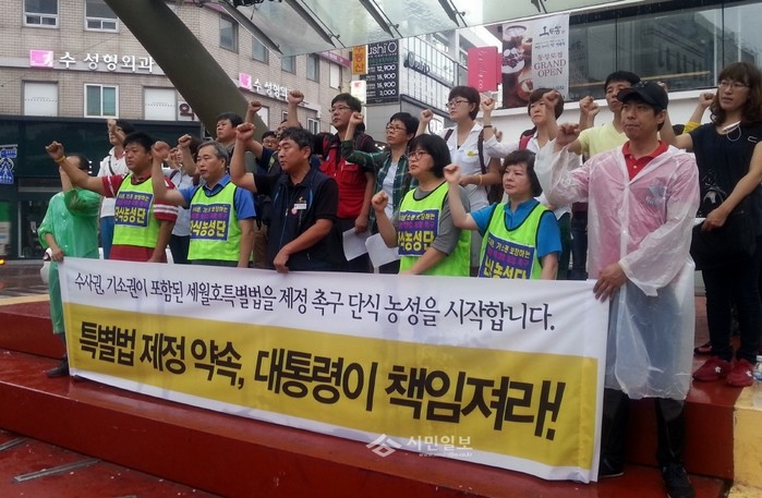 25일 오전 대구지역 시민단체로 구성된 '세월호 참사 대구시민대책위원회'가 대구 중구 동성로 야외무대에서 기자회견을 열고 수사권과 기소권이 포함된 '세월호 특별법'이 제정될 때까지 무기한 단식 천막농성에 들어간다고 밝히고 있다. 대구시민대책위는 지난 5월부터 세월호 참사 유가족 대책위원회와 '세월호 특별법' 제정을 위한 1000만인 서명운동을 벌여왔다.
