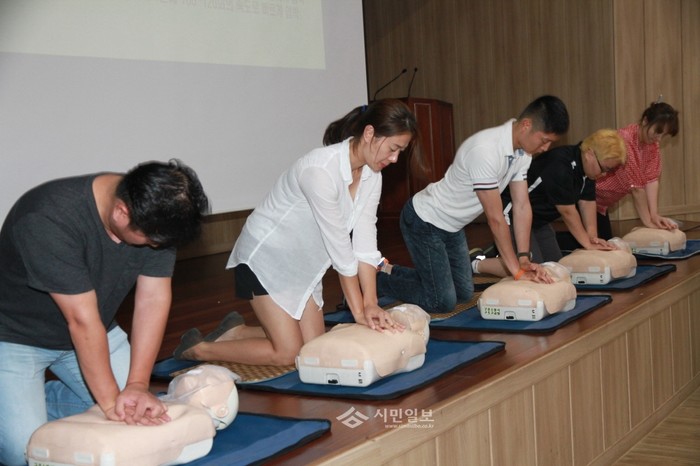 서울 구로소방서는 최근 구로구와 금천구에서 신규 또는 지위 승계해 영업을 시작한 다중이용업 영업주와 종업원 등을 대상으로 소방서 대강당에서 '맞춤형 소방안전교육'을 실시했다. 사진은 심페소생술을 체험 중인 참가자들의 모습. (사진제공=구로소방서)