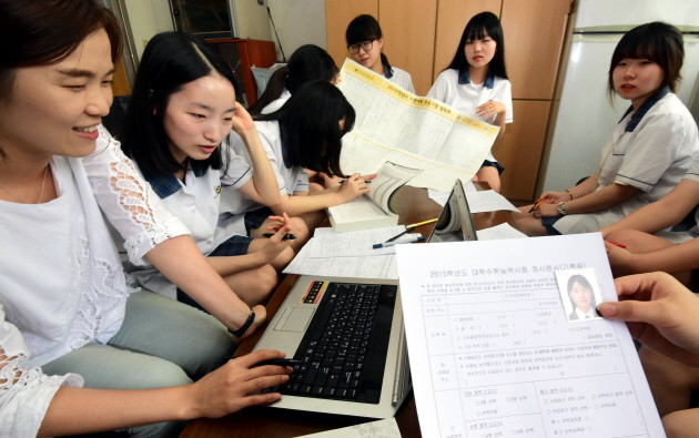 2015학년도 대입 수학능력시험 원수접수가 시작된 25일 오전 경기 수원의 한 고등학교 진학상담실에서 선생님이 고3 학생들에게 원서작성법을 설명하고 있다.