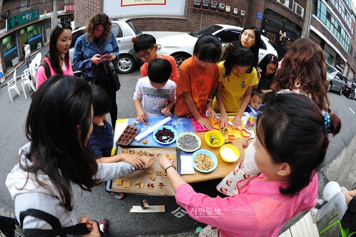 | ▲ 서강동 '예찬길'에서 진행된 '쿠키 만들기 체험 행사'에 참여한 아이들이 직접 쿠키를 만들고 있다. | ||