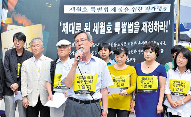 26일 오전 서울 광화문 광장에서 시인과 작가들이 ‘한국작가회의 세월호 동조단식 기자회견’을 하고 있다.