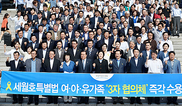 새정치민주연합 박영선 국민공감혁신위원장을 비롯한 의원들이 26일 오전 서울 여의도 국회 본청 앞 계단에서 열린 ‘세월호 특별법 제정을 위한 결의대