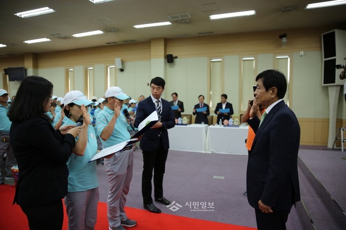 지난 26일 인천 중구청 월디관 대회의실에서 열린 '2014 인천아시안경기대회 및 장애인아시안경기대회 인천 중구 자원봉사자 발대식'에 참석한 김홍섭 중구청장이 봉사자 대표의 선서문 낭독을 듣고 있다. (사진제공=중구청)