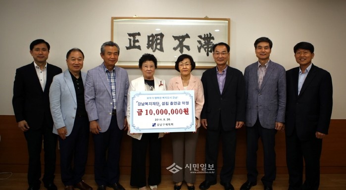 신연희 강남구청장(오른쪽에서 네번째)이 지난 26일 구청에서 강남구체육회 한경자 수석부회장(오른쪽에서 다섯 번째)이 어려운 이웃을 위한 다양한 복지활동에 써달라며 전달한 강남복지재단 출연금 1000만원을 받고 관계자들과 기념촬영을 하고 있다. (사진제공=강남구청)