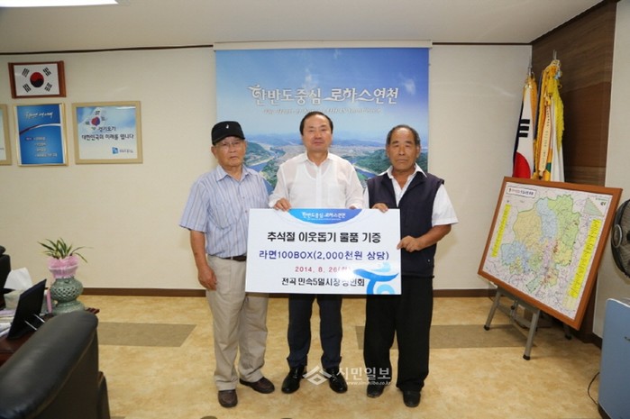경기 연천군 전곡 민속 5일장 상인회는 최근 추석을 맞아 어려운 이웃에게 전달해달라며 라면 100상자(200만원 상당)를 연천군수실의 김규선 연천군수(가운데)에게 현물 기탁하고 기념촬영을 하고 있다. (사진제공=연천군청)