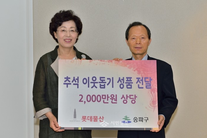 지난 26일 서울 송파구청실에서 이원우 롯데물산 대표(오른쪽)가 추석을 맞아 저소득 가정을 위해 2000만원 상당의 라면 1000상자를 박춘희 송파구청장(왼쪽)에게 이웃돕기 성품으로 전달했다. (사진제공=송파구청)