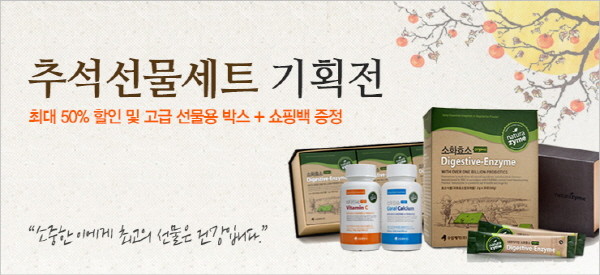 이번 기획전은 수암제약의 베스트셀러인 소화효소를 바탕으로 비타민효소, 칼슘효소를 더한 다양한 추석 선물세트로 구성되어 있으며, 최대 50%까지 할인된 가격으로 행사상품이 책정되어 있어 주머니의 부담을 덜 수 있다. 게다가 고급 선물용 박스와 쇼핑백까지 동봉하므로 추석 선물용으로 부족함이 없다.
