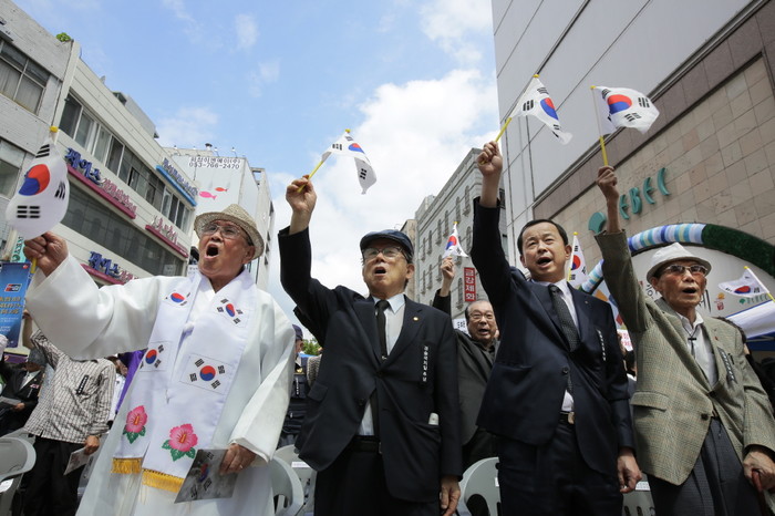 29일 오전 대구 중구 동성로 야외무대 앞 광장에서 광복회 대구지부 주최로 '제104주년 경술국치일 추념식 및 아베 정권 규탄대회'가 열린 가운데 생존 애국지사와 광복회원들이 일제강점에 대한 아베정권의 반성를 촉구하고 있다.