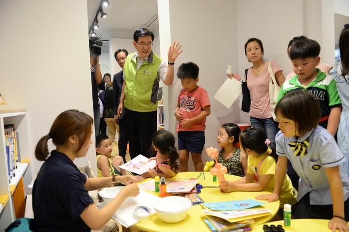 28일 개관식을 시작으로 본격적인 운영에 들어간 '구립 휘경 어린이도서관'을 방문한 유덕열 동대문구청장이 아이들에게 인사를 건네고 있다. 한편 휘경어린이도서관은 지하 1층, 지상 2층의 연면적 305.84㎡ 규모로 지어졌다. (사진제공=동대문구청)