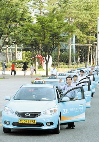 29일 오전 서울 중구 세종대로 서울광장에서 오는 9월 시범 운영되는 하늘색 전기택시를 운전하는 기사들이 파이팅을 외치고 있다. 서울시는 연료비가 일반 LPG택시에 비해 13% 수준으로 저렴하고 배출가스가 없어 친환경적인 전기차 ‘SM3 Z.E.’ 10대를 활용해 9월부터 내년 4월까지 전기택시를 시범 운영한다. 이용요금은 기존 택시와 마찬가지로 기본 3000원이고, 이후 142m당 100원(시간요금은 35초당 100원, 15km/h 미만 시에만 적용)이 붙는다.