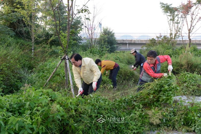 지난 29일 경기 양주시가 시민들의 건강을 보호하고 토종식물의 서식지를 보존하기 위해 충랑천변 200m 구간에서 200여명이 참여한 가운데 생태계를 교란시키는 외래식물 단풍잎돼지풀 제거작업을 실시했다. 사진은 제초작업 중인 현삼식 시장(왼쪽)의 모습.(사진제공=양주시청)