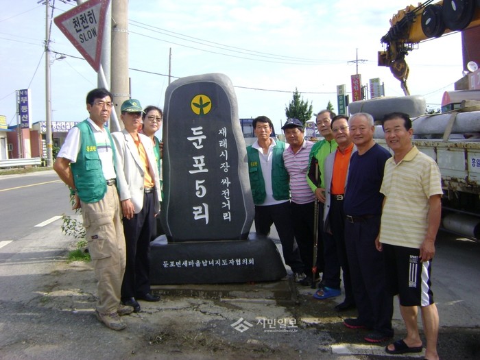 최근 충남 아산시 둔포면에 새마을운동 활성화 특화사업의 일환으로 추진된 '마을표지석 사업'의 결실로 새마을 정신을 기리는 표지석이 건립됐다. 사진은 둔포5리 표지석을 배경으로 기념촬영 중인 둔포면 새마을협의회 관계자들의 모습. (사진제공=아산시청)