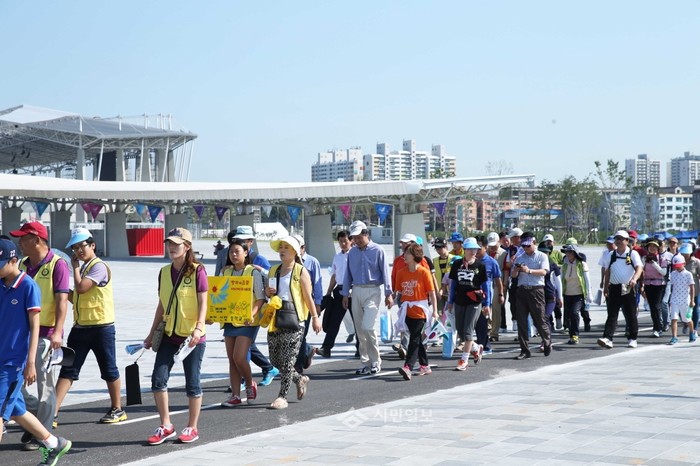 최근 인천시 서구가 주최하고 <경인방송>이 주관한 '2014 가족 사랑워킹데이'에 참가한 시민들이 '2014 인천 AG·APG'의 성공개최를 기원하며 걷기행사에 참여하고 있다. (사진제공=서구청)