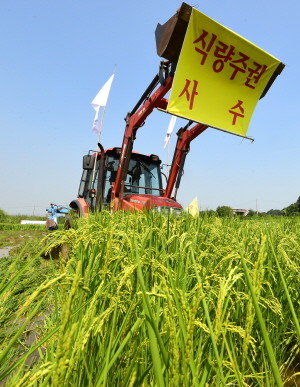 1일 오전 경기 평택 오성면 양교리의 한 논에서 열린 '농민포기 주권포기 박근혜정부 규탄 경기농민 투쟁 선포식'에서 전농 경기도연맹 소속 농민들이 이삭이 나온 벼를 갈아엎고 있다. 전농 경기도연맹은 박근혜 정부의 쌀개방 선언은 주권을 팔아먹는 매국행위이고, 식량주권인 쌀을 지키기 위해 투쟁에 돌입한다고 선언했다.