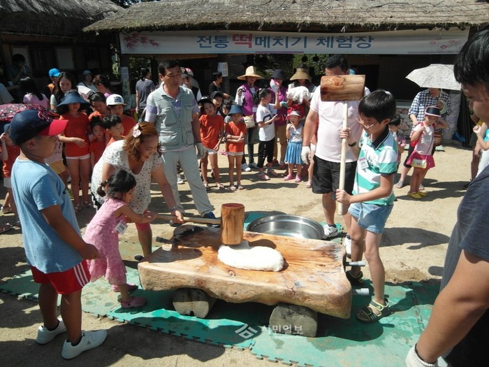 지난 8월30일 충남 아산시 드림스타트센터가 지역내 저소득층 아동들에게 추석을 맞아 가족간의 화합을 도모하고 문화체험의 기회를 제공하기 위해 송악면 외암리 민속마을에서 '명절맞이 전통문화체험'을 실시했다. 사진은 떡메치기 체험 중인 참여자들의 모습. (사진제공=아산시청)