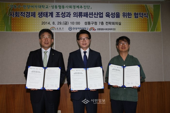 서울 성동구는 지난 29일 사회적 경제와 의류패션산업을 접목해 활성화하고 경쟁력을 향상시키기 위해 한양여대, 성동협동사회경제추진단과 업무협약을 체결했다. 사진은 한양여대 노덕주 총장, 정원오 성동구청장, 신만수 성동협동사회경제추진단대표가 기념촬영을 하는 모습. (사진제공=성동구청)