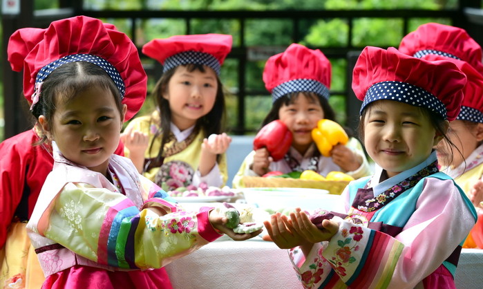 추석을 앞둔 2일 오전 경기 화성 경기도농업기술원에서 열린 '어린이 바른 먹거리 요리 교실'에서 한복을 차려입은 어린이들이 텃밭에서 직접 수확한 재료로 송편을 만들어 보이고 있다.