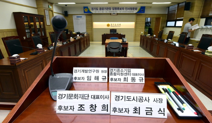 전국 최초로 열리는 '공공기관장 인사청문회'를 하루 앞둔 3일 경기 수원 경기도의회 한 회의실에 인사청문회장이 마련돼 있다. 이번 청문회에는 경기개발연구원장 임해규 후보자, 경기중기센터 대표 최동규 후보자, 경기문화재단 대표 조창희 후보자, 경기도시공사 사장 최금식 후보자를 대상으로 진행될 예정이다.