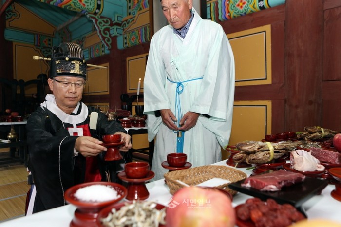 경기 가평향교 대성전에서 열린 공자의 학덕과 유풀을 기리고 추모하는 '2565주년 추기 석전제'에 참가한 김관수 가평부군수가 초헌관이 돼 제례를 올리고 있다. (사진제공=가평군청)