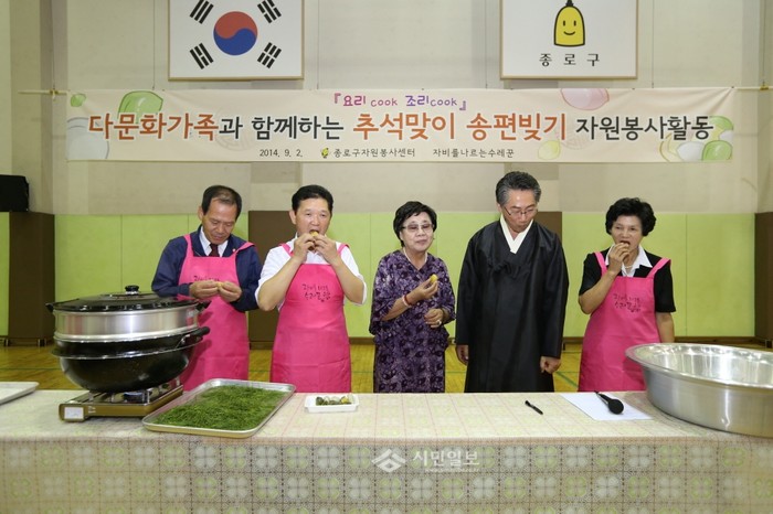 종로구에서는 다문화가정 지원 및 아시아 빈곤 국가를 대상으로 교육, 환경, 주거개선사업을 실시하고 있는 ‘자비를 나르는 수레꾼’을 비롯하여 다문화가족, 자원봉사자 등 55명이 참여한 가운데 민족 대명절인 추석을 맞아 다문화 가정주부들과 함께 관내 어려운 이웃들을 위해 송편을 빚어 전달하는 행사를 가졌다.