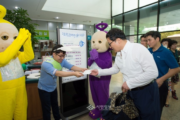 지난 3일 오전 업무시작 전 서울 양천구가 업무에 지친 직원들의 사기를 진작시키고 내부청렴도를 향상시키기 위해 1층 로비에서 감사담당관실 직원들이 출근하는 직원을 맞이하며 안아주는 등 '행복한 직장 만들기' 이벤트를 진행했다. 사진은 캐릭터와 함께 인사 중인 감사담당관실 직원의 모습. (사진제공=양천구청)