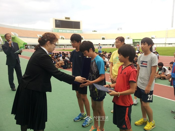 지난 1일 경북 구미 시민운동장에서 개최된 '제33회 교육장기 육상경기 대회'에서 종합우승을 거둔 야은초등학교 학생들이 상을 수여받고 있다. (사진제공=구미교육지원청)