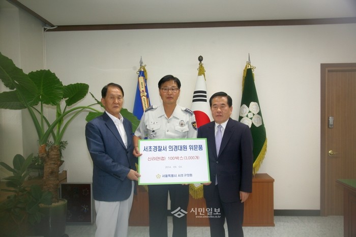 지난 3일 최병홍 서울 서초구의장(우)과 권영중 부의장(좌)이 우리 고유민속 명절인 추석을 맞아 지역안보 및 생활치안에 노고가 많은 의경대원들을 격려하고자 서초경찰서에 라면 100박스(3000개)를 기부했다.(사진제공=서초구의회)