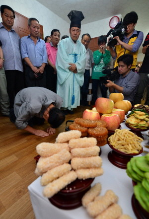 추석 연휴가 이틀 앞으로 다가온 4일 오전 서울 동대문구 한 쪽방촌에서 주민들이 합동차례를 지내고 있다.