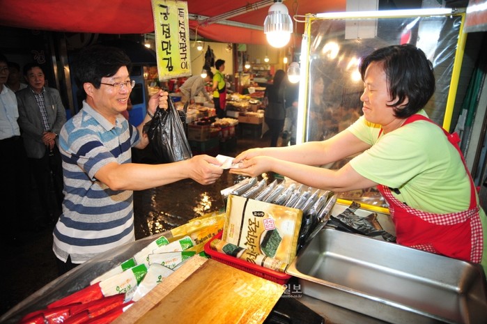 지난 3일 염태영 수원시장이 추석 명절 지역경제의 중추적 역할을 담당하는 전통시장 중소상인들을 격려하기 위해 전통시장을 방문해 온누리상품권으로 시장에서 물건을 구매하고 있다.(사진제공=수원시청)