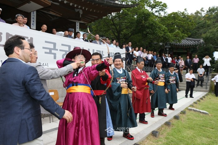 최근 개관한 '황학정 국궁전시관' 개관식에 참석한 김복동 종로구의장(왼쪽에서 3번째)이 전통복장을 입고 활쏘기 체험을 하고 있다.(사진제공=종로구의회)