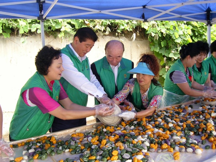 최근 경기 남양주시 새마을회관 주차장에서 열린 '사랑의 송편 빚어 나누어주기' 행사에 참가한 이석우 남양주 시장이 직접 송편을 빚고 있다. 이날 행사에는 이 시장과 이철우 남양주시의장, 경기도의원, 남양주시의원 등을 비롯한 새마을부녀회 관계자들이 참석했다. (사진제공=남양주시청)