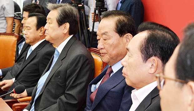 11일 오전 서울 여의도 국회 새누리당 대표실에서 열린 최고위원회의에서 김무성 대표와 이완구 원내대표, 서청원 최고위원 등 지도부가 굳은 표정을 하고 있다.