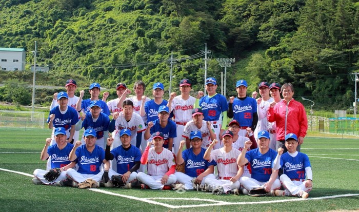 최근 서울 용산구의회 김성열 의원(뒷줄 오른쪽 다섯번째)이 단장으로 있는 용산구청 피닉스 야구단 관계자들이 교류행사의 일환으로 울릉군청 야구단의 초청을 받아 울릉군을 방문해 함께 기념촬영을 하고 있다. (사진제공=용산구의회)
