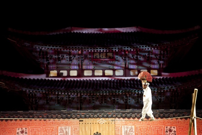 | ▲ 광화문을 지나면 보이는 경복궁의 첫번째 문 흥예문을 배경으로 전통 줄타기가 시연되는 모습 | ||
