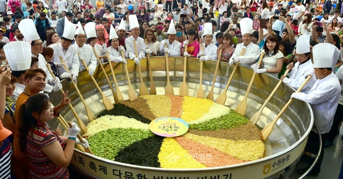 14일 오전 경기 수원 야외음악당에서 열린 다문화 한가족 축제에서 내빈들과 다문화가족 대표 등이 2014인분 다문화 비빔밥을 비비고 있다.