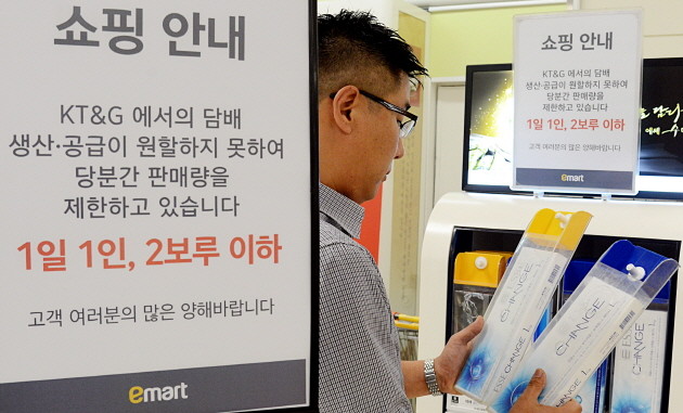 원활한 물량 수급을 위해 1인당 2보루(20갑)로 담배 구매를 제한하기로 한 안내문이 게시된 가운데 14일 서울 이마트 천호점에서 소비자가 담배 2보루를 구입하고 있다. 이마트 관계자는 “KT&G로부터 물량 공급이 원활하게 이뤄지지 않는 상황에서 더 많은 고객에게 구매기회를 드리기 위해 담배 구매 수량을 제한했다”고 설명했다.