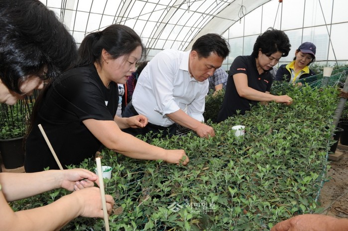 최근 이재준 수원시제2부시장과 태장동 마을만들기 사업추진단 주민 20여명은 경기 수원시 태장동 국화재배 현장을 방문해 오는 10월21일에 열리는 '제3회 태장국화축제' 준비에 한창인 방죽머리르네상스 추진협의회 회원들을 도와 국화 정비작업을 실시했다. (사진제공=수원시청)