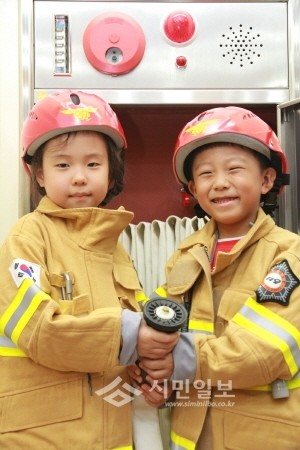15일 서울 구로소방서를 방문한 원진어린이집 원생들이 위급상황 발생시 초기 대응능력을 키우기 위해 실시된 '소방안전체험교실' 프로그램에 참가해 보호장비를 직접 착용하고 소방 호스를 들고 있다. (사진제공=구로소방서)